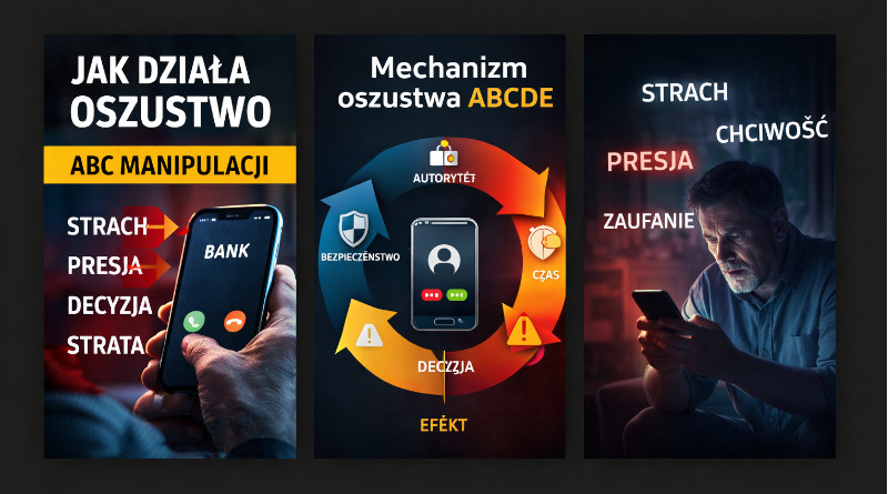 Schemat ABC pokazuje więc, że oszustwo to proces: najpierw namawia się ofiarę do zaufania, potem osłabia jej czujność i wymusza pośpiech, a dopiero potem dochodzi do przestępstwa.